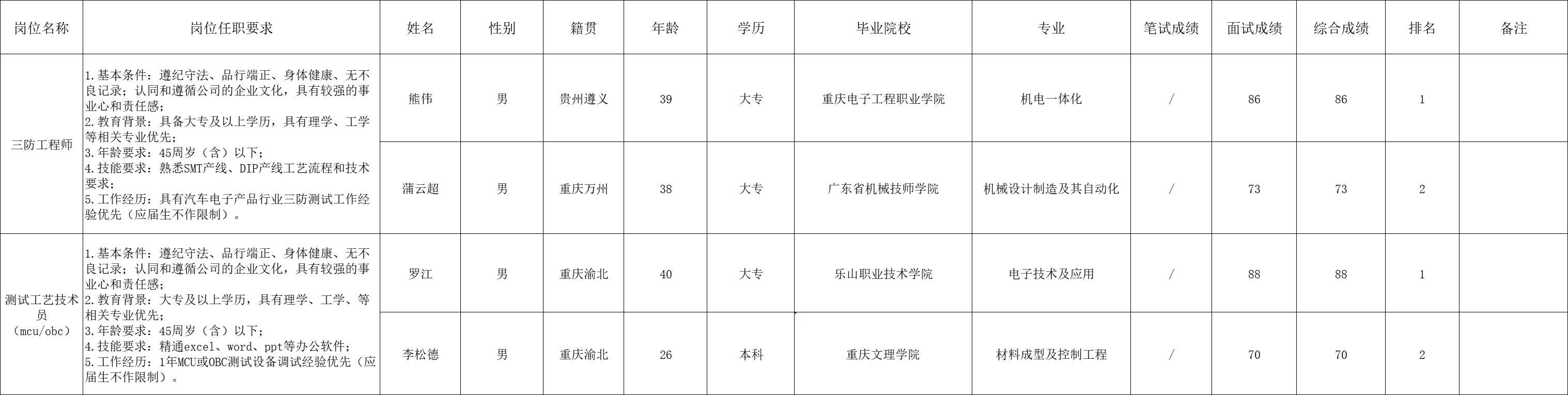根据重庆九洲智造科技有限公司发布的招聘公告及招聘相关规定,经笔试、面试等程序,现将笔试(面试)成绩予以公示: