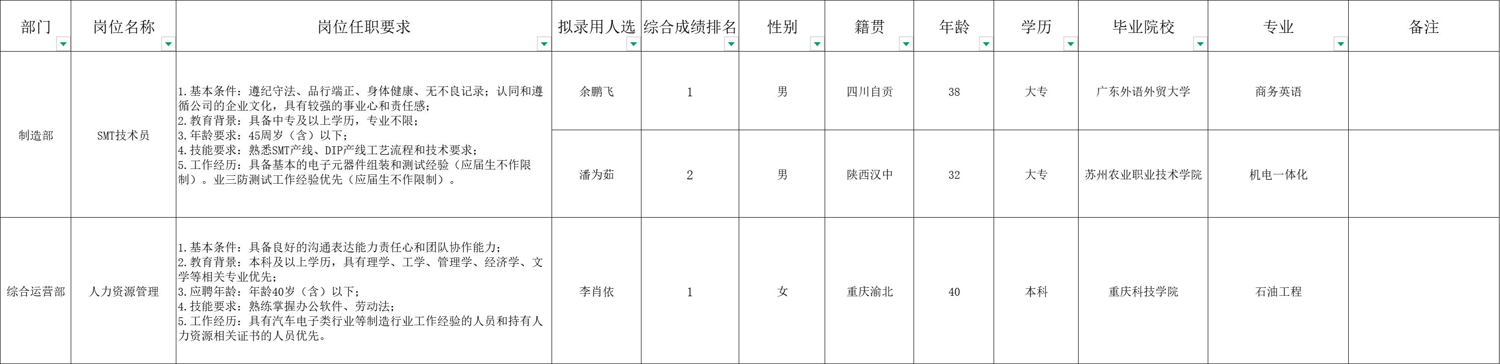 根据重庆九洲智造科技有限公司发布的招聘公告及招聘相关规定,经笔试、面试、考察、体检等程序,拟录用余鹏飞等3名同志到重庆九洲智造科技有限公司工作: