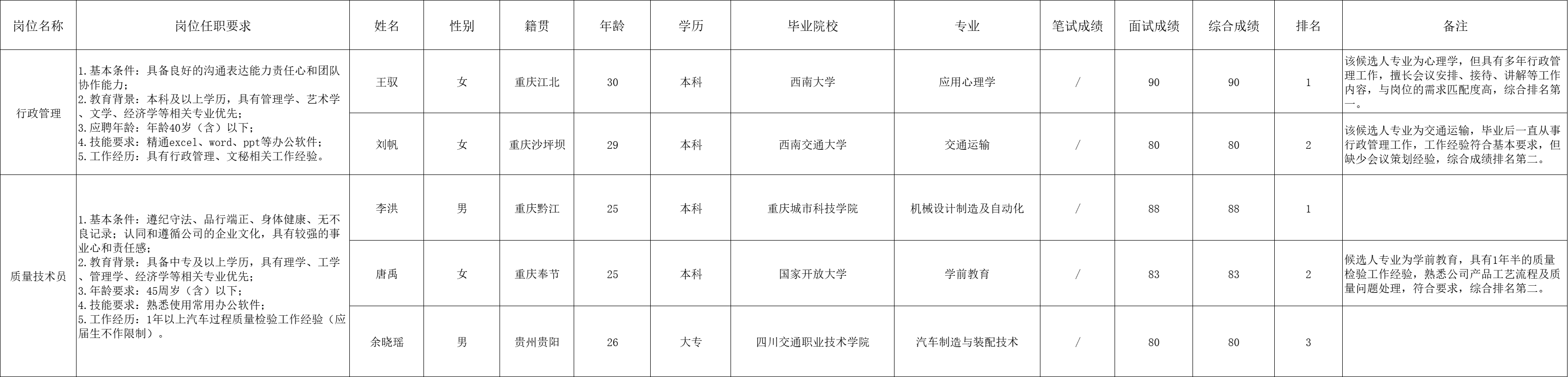 根据重庆九洲智造科技有限公司发布的招聘公告及招聘相关规定,经笔试、面试等程序,现将笔试(面试)成绩予以公示: