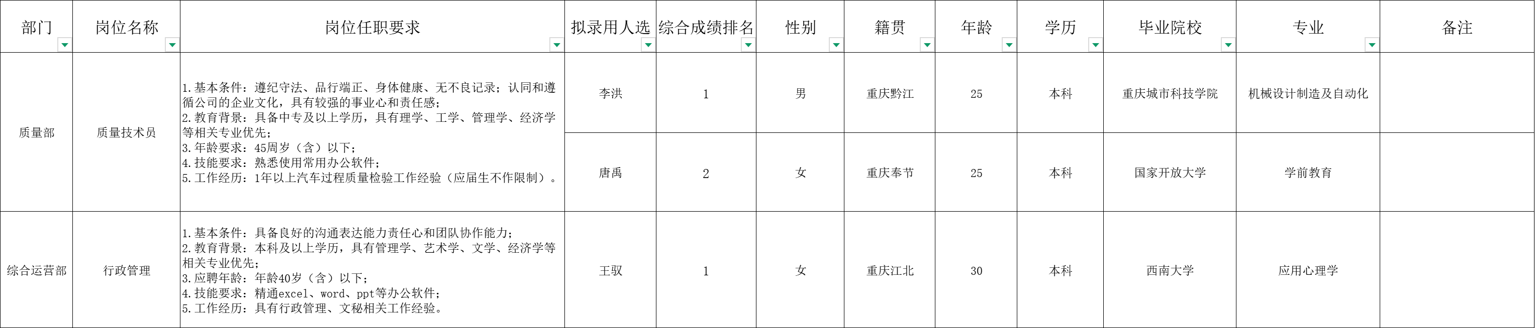 根据重庆九洲智造科技有限公司发布的招聘公告及招聘相关规定,经笔试、面试、考察、体检等程序,拟录用王驭等3名同志到重庆九洲智造科技有限公司工作: