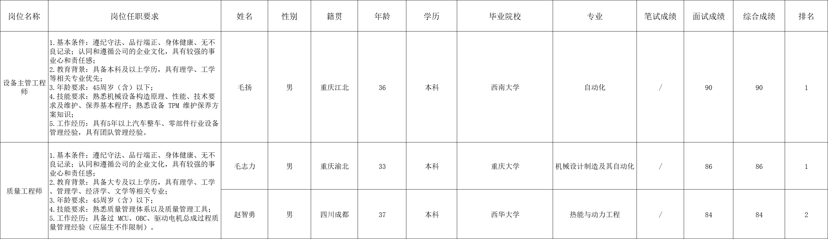 根据重庆九洲智造科技有限公司发布的招聘公告及招聘相关规定,经笔试、面试等程序,现将笔试(面试)成绩予以公示: