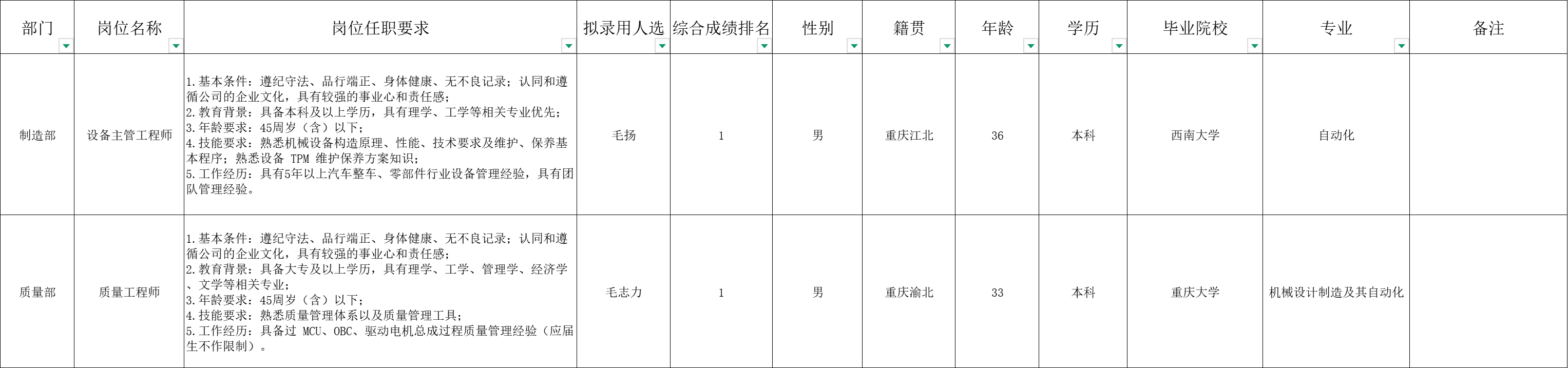 根据重庆九洲智造科技有限公司发布的招聘公告及招聘相关规定,经笔试、面试、考察、体检等程序,拟录用毛志力等2名同志到重庆九洲智造科技有限公司工作: