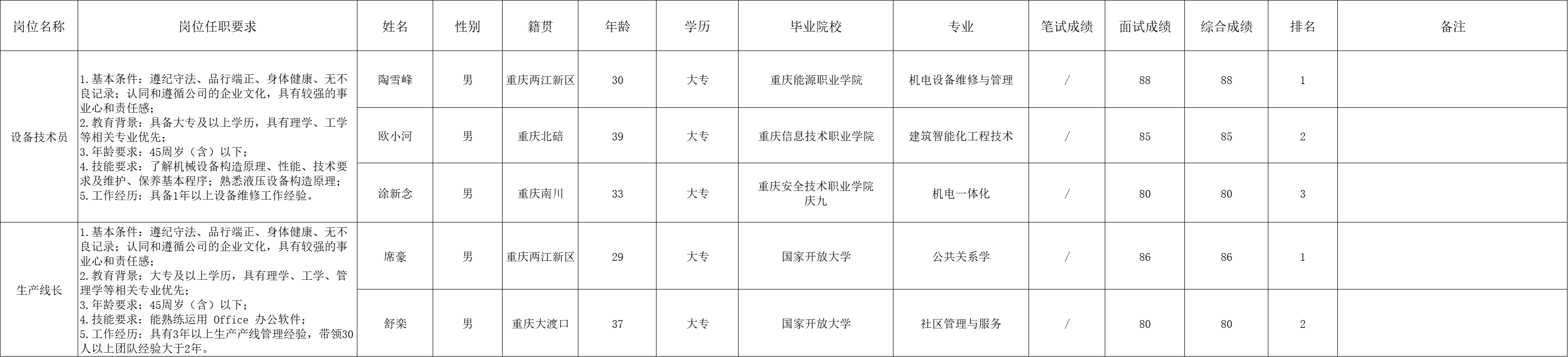 根据重庆九洲智造科技有限公司发布的招聘公告及招聘相关规定,经笔试、面试等程序,现将笔试(面试)成绩予以公示: