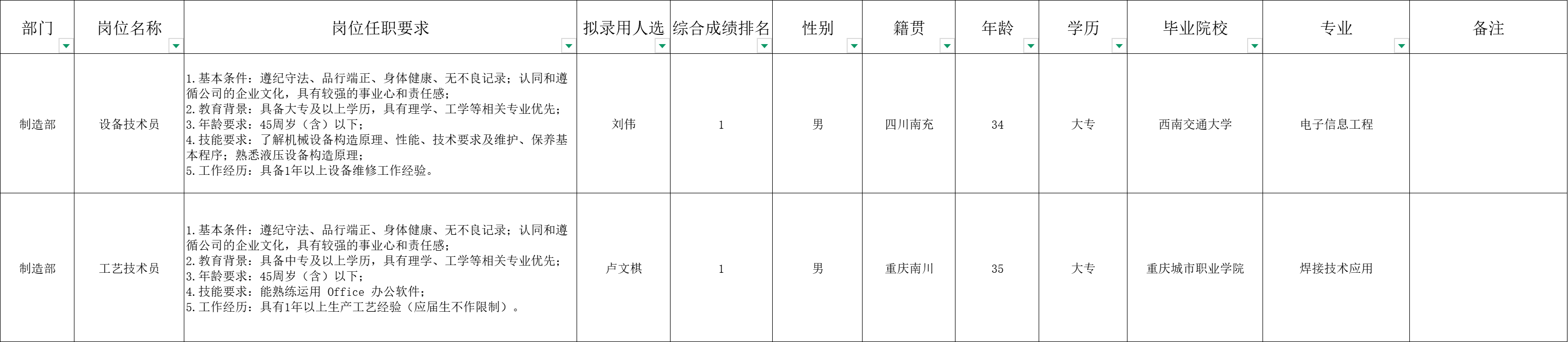 根据重庆九洲智造科技有限公司发布的招聘公告及招聘相关规定,经笔试、面试、考察、体检等程序,拟录用卢文棋等2名同志到重庆九洲智造科技有限公司工作: