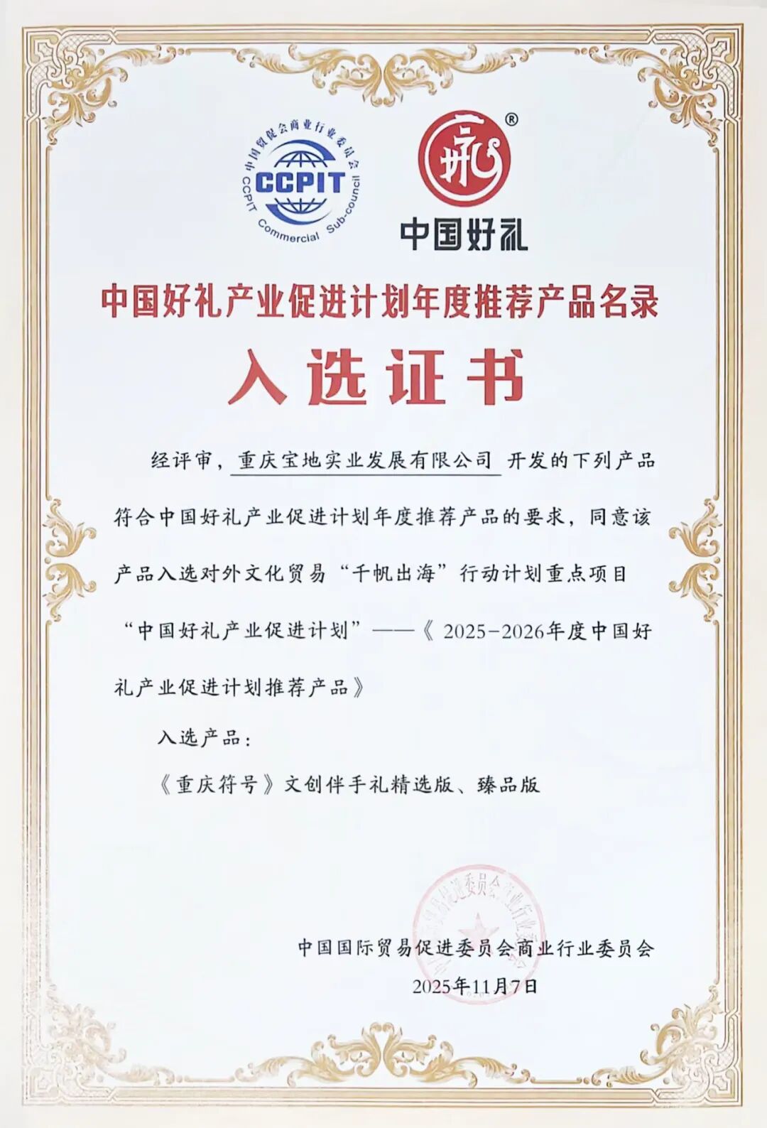 近日,重庆宝地实业发展有限公司(以下简称宝地公司)旗下“国货精品贸易中心”打造的《重庆符号》文创伴手礼,成功入选中国国际贸易促进委员会“中国好礼产业促进计划2025-2026年度推荐产品名录”,正式跻身国家级文化产品推荐平台。