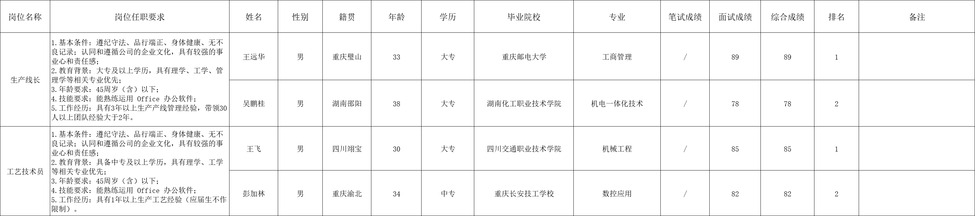 根据重庆九洲智造科技有限公司发布的招聘公告及招聘相关规定,经笔试、面试等程序,现将笔试(面试)成绩予以公示: