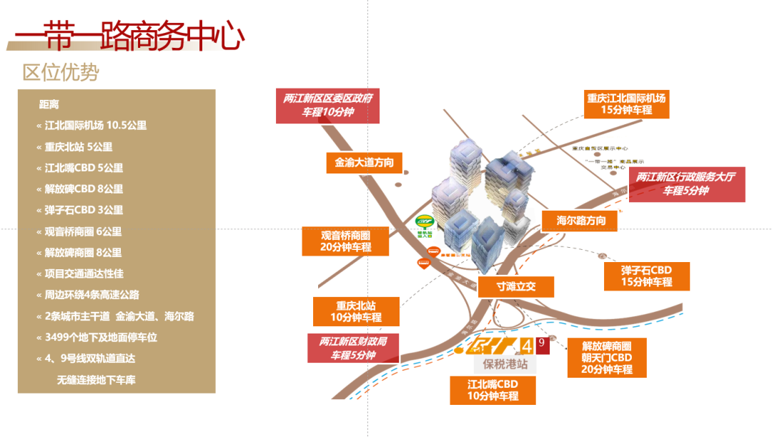 作为此次合作的核心载体,重庆“一带一路”商务中心坐拥显著的区位优势与发展潜力。项目位于两江新区寸滩国际新城保税经济区,地处重庆经济发展的核心地带,毗邻江北国际机场、重庆火车北站,坐享“5公里黄金经济圈”的立体交通网络,区位条件优越。
