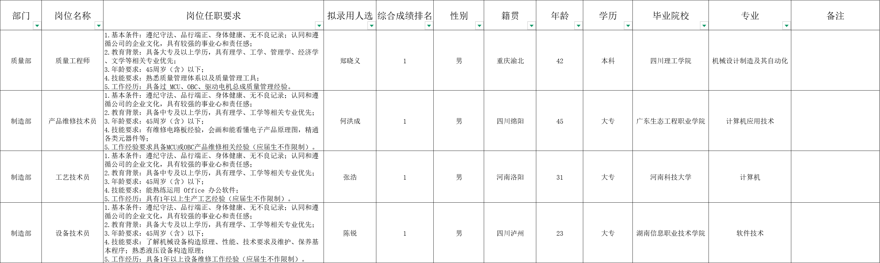 根据重庆九洲智造科技有限公司发布的招聘公告及招聘相关规定,经笔试、面试、考察、体检等程序,拟录用张浩等4名同志到重庆九洲智造科技有限公司工作: