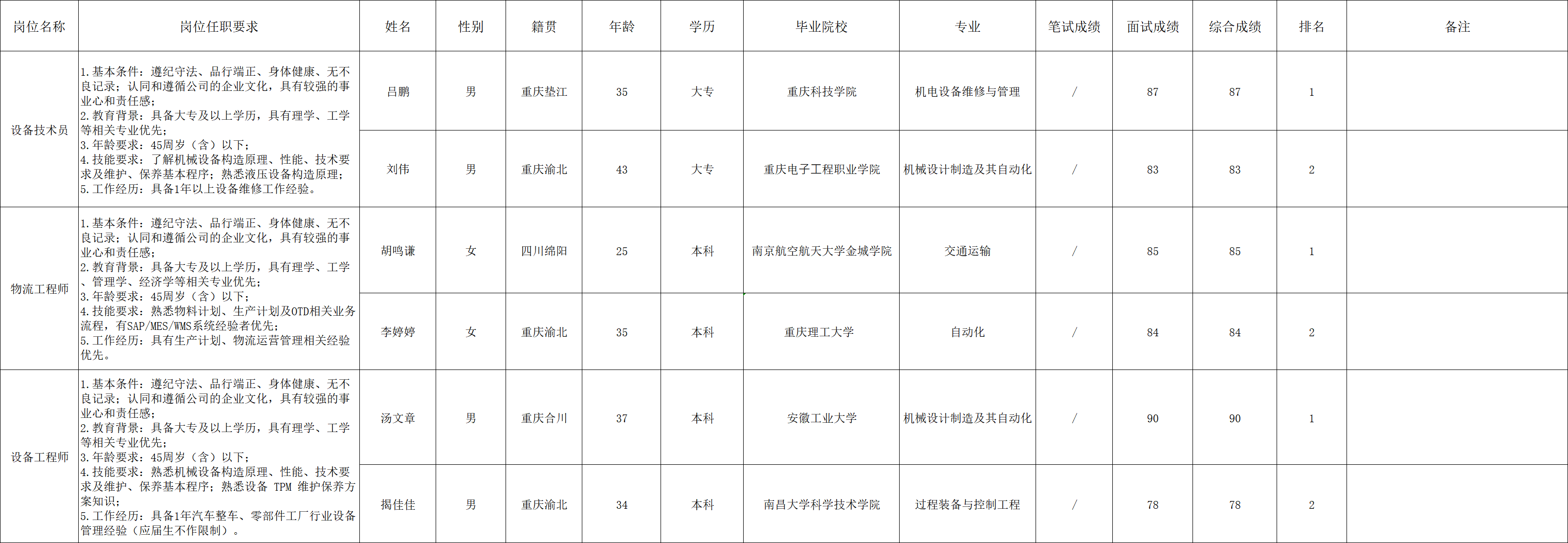 根据重庆九洲智造科技有限公司发布的招聘公告及招聘相关规定,经笔试、面试等程序,现将笔试(面试)成绩予以公示: