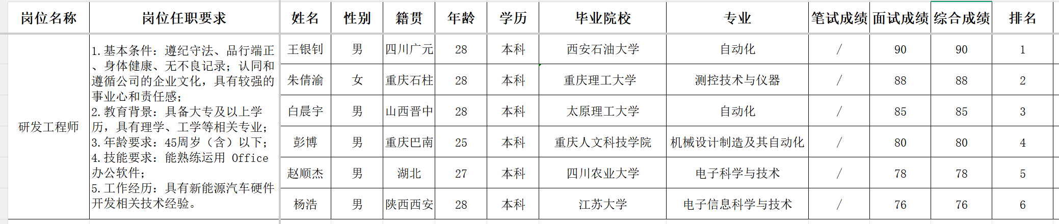 根据重庆九洲智造科技有限公司发布的招聘公告及招聘相关规定,经笔试、面试等程序,现将笔试(面试)成绩予以公示: