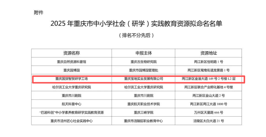 近日,重庆市教育委员会印发《关于确认2025年重庆市中小学社会(研学)实践教育资源名单的通报》,重庆两路果园港综保区(以下简称“综保区”)的国货精品贸易中心研学基地(国货智贸研学工场)成功入选2025年重庆市中小学社会(研学)实践教育资源认定名单。