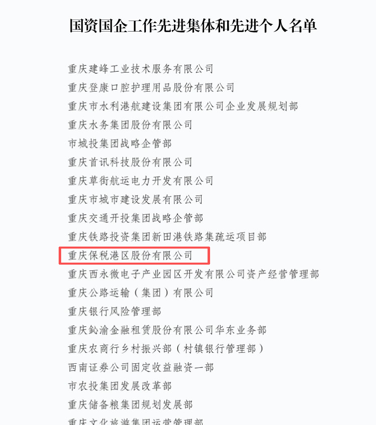 日前,重庆市人力社保局、市国资委联合发布《关于表彰国资国企工作先进集体和先进个人的决定》,重庆保税港区股份有限公司(以下简称“股份公司”)凭借过去一年在改革发展工作中的突出表现和显著成效,荣获“国资国企工作先进集体”称号。