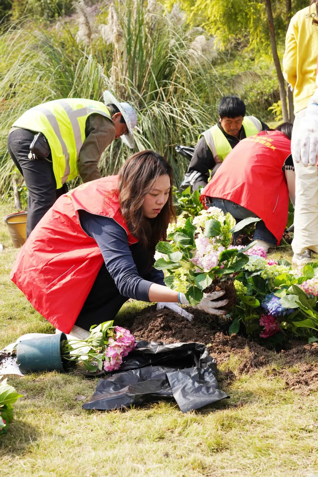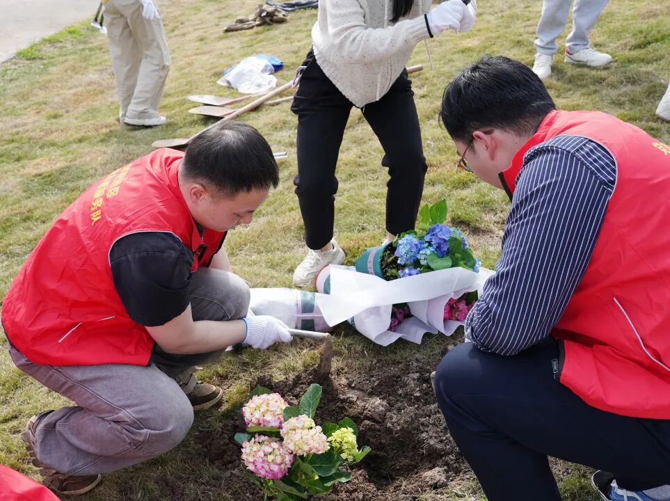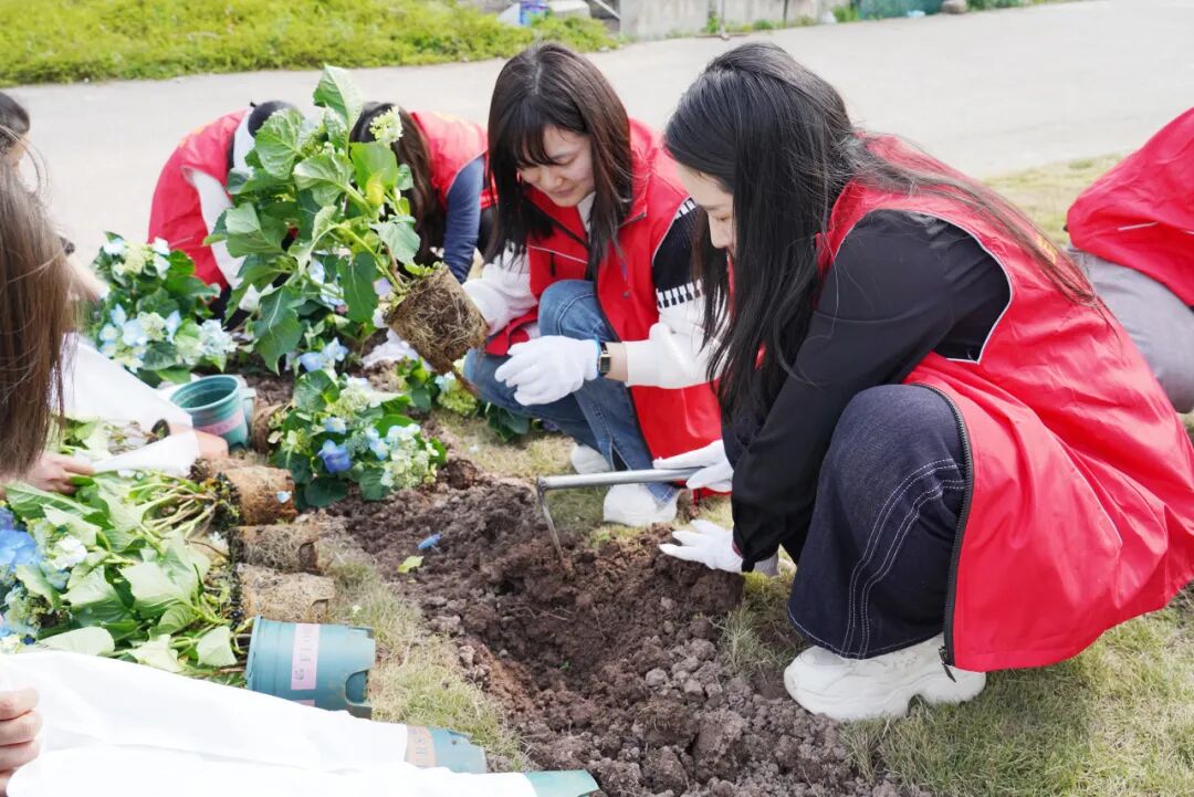 现场,工作人员讲解花卉种植要领、注意事项,并进行实操示范,随后团员青年自行分组、默契配合,迅速投入到花卉种植工作中。
