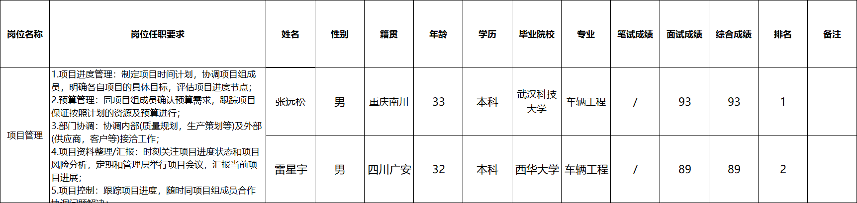 根据重庆九洲智造科技有限公司发布的招聘公告及招聘相关规定,经笔试、面试等程序,现将笔试(面试)成绩予以公示: